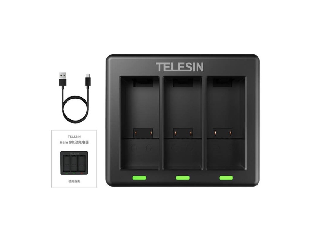 Nabíječka Telesin umožňuje rychle nabíjet až 3 baterie akčních kamer GoPro Hero 12 / Hero 11 / Hero 10 / Hero 9 současně. Pokročilý bezpečnostní systém je chrání před poškozením. Díky nízké hmotnosti 27,5 g a kompaktním rozměrům je zase ideální i na cesty. Zařízení bylo vybaveno speciálními LED diodami, které při nabíjení svítí červeně a při plném nabití baterie zeleně.