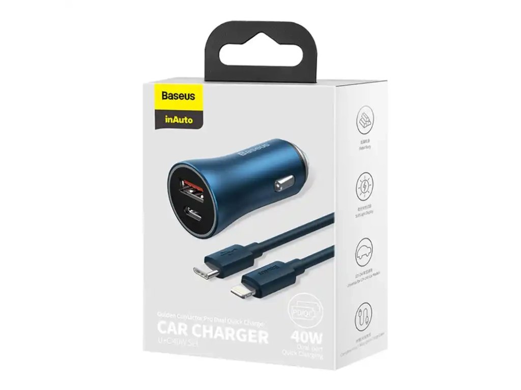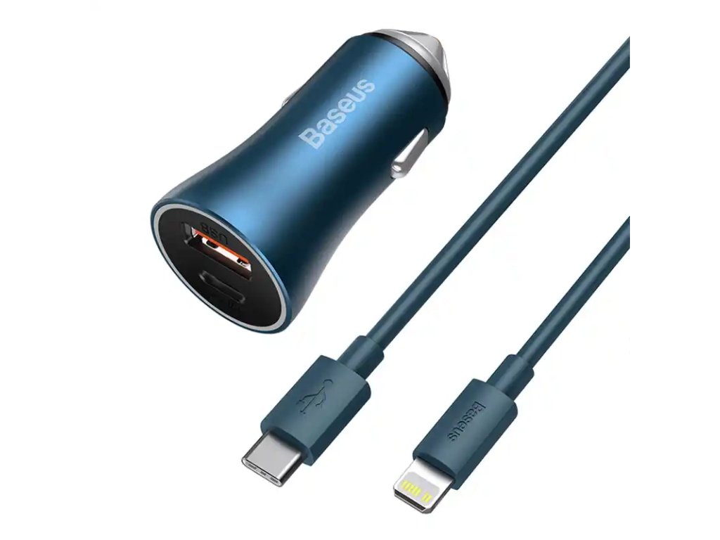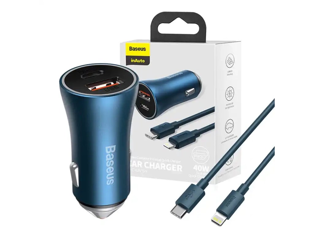 Baseus Golden Contactor Pro nabíječka do auta, USB USB-C, QC4.0 , PD, SCP, 40W (modrá) USB-C - Lightning kabel 1m (modrá)