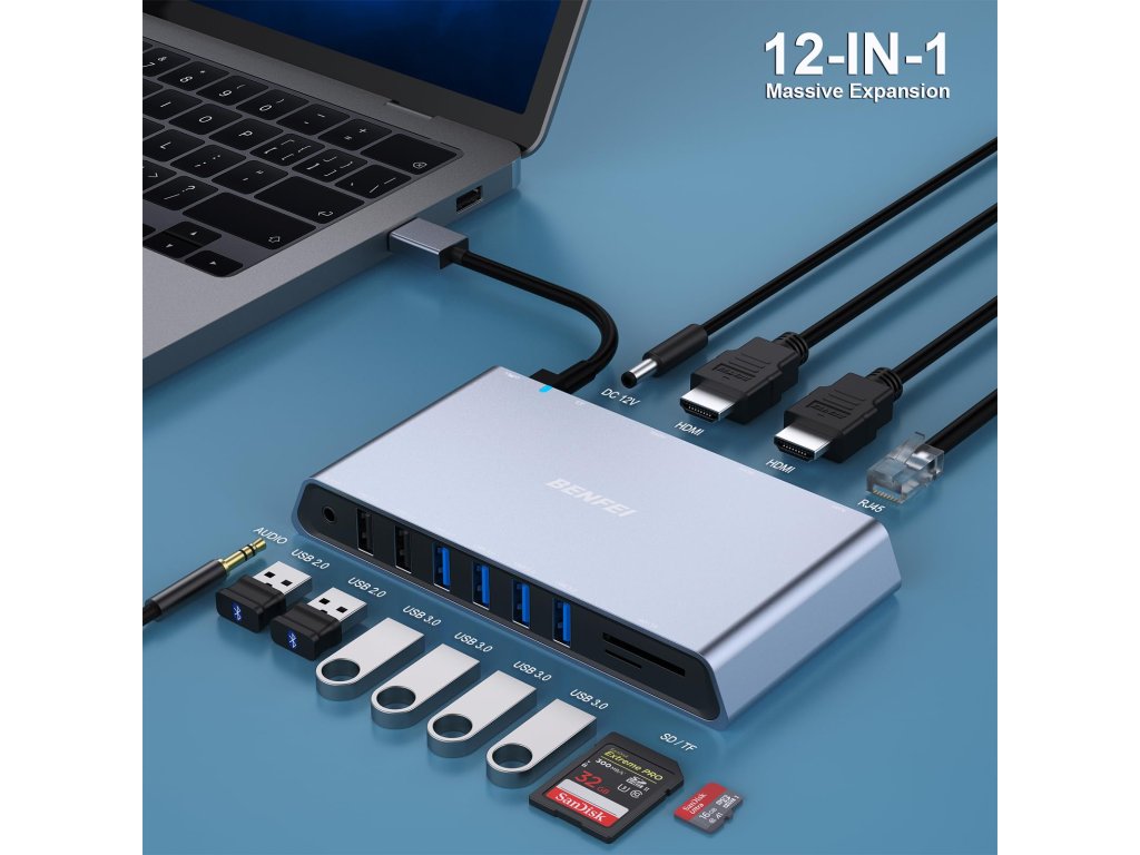 BENFEI USB-C HUB 12v1 je ideální řešení pro ty, kteří hledají výkonný, spolehlivý a všestranný rozbočovač pro svůj pracovní nebo domácí setup.