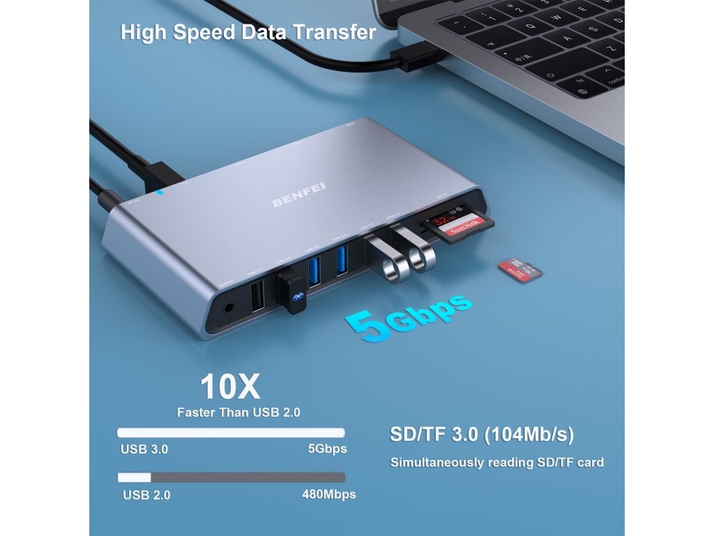 Zařízení je kompatibilní s Windows i MacOS, což z něj činí ideální volbu pro širokou škálu uživatelů. Nezáleží, jestli pracujete na kancelářském notebooku nebo domácím počítači, BENFEI HUB se přizpůsobí vašim potřebám.