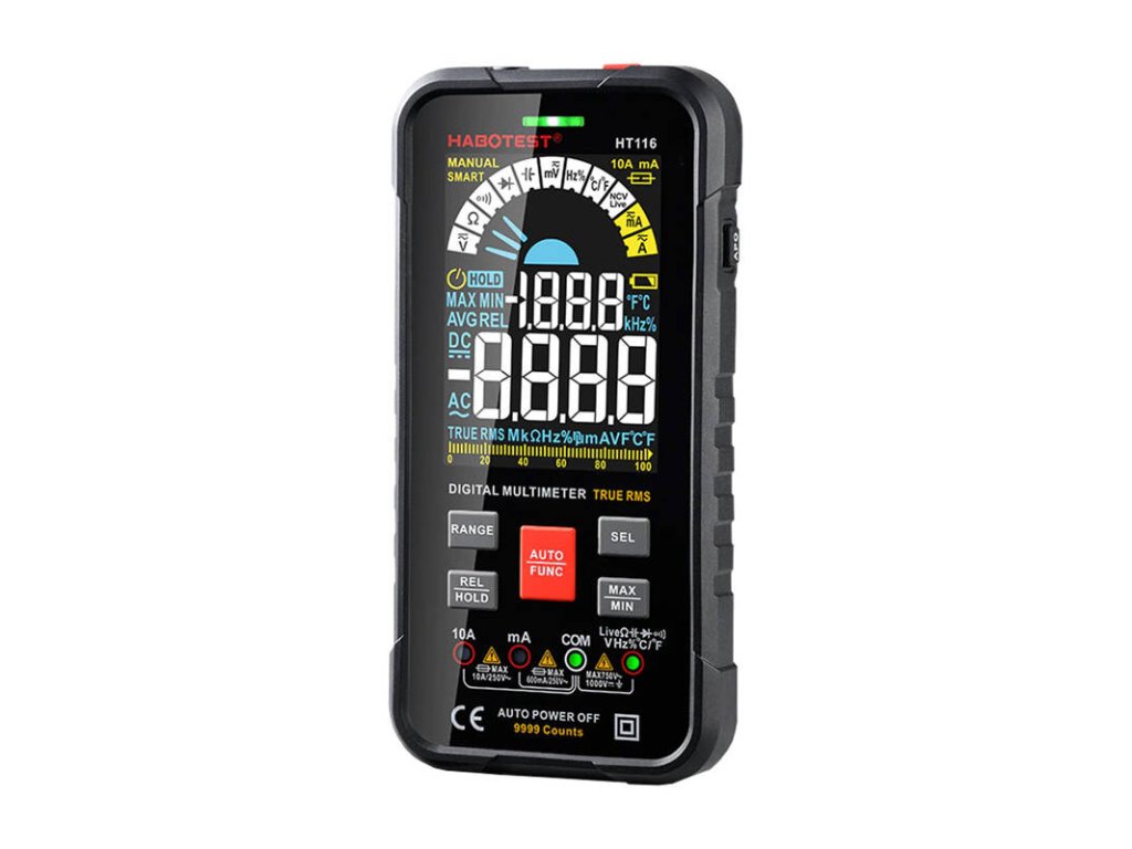 HT116 je inteligentní multimetr, který můžete použít k přesnému měření střídavého a stejnosměrného napětí, odporu, spojitosti, kapacity a dalších hodnot. Velký displej a tlačítka usnadňují ovládání a poskytují snadný přístup k výsledkům měření. Přístroj je navíc vybaven svítilnou, která usnadní práci v tmavých místnostech. K napájení HT116 jsou zapotřebí 3 baterie AAA.