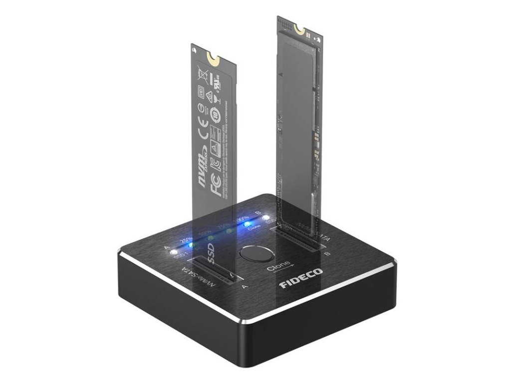Rozšiřte své možnosti s dokovací stanicí FIDECO M2288, která nabízí podporu M.2 NVMe a SATA SSD. Díky 20Gb/s offline klonování nepotřebujete počítač, abyste mohli snadno přenášet data mezi disky. Nezapomeňte, že aby bylo klonování možné, musí být kapacita cílového disku větší než kapacita zdrojového disku.