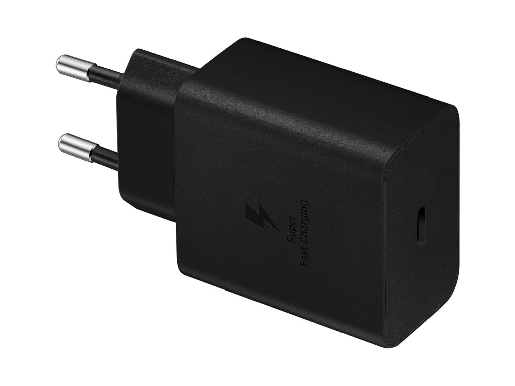 Samsung cestovní síťová nabíječka s maximálním výkonem 45W a s 1x USB-C výstupem a USB-C kabelem.