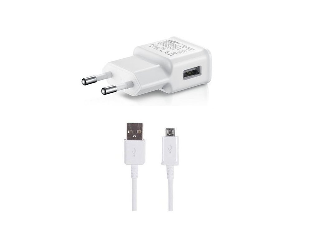 Samsung cestovní nabíječka do sítě s USB výstupem a maximálním výkonem 15W a microUSB nabíjecím kabelem.
