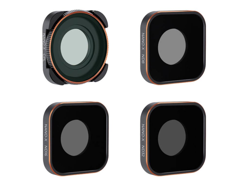Sada obsahuje filtr CPL a 3 typy ND filtrů. Každý z nich dokonale funguje v různých scénářích. Například filtr CPL snižuje odlesky a zvýrazňuje modrou barvu oblohy - úspěšně jej využijete při fotografování krajiny. Filtr ND8 (3 stupně) najde uplatnění v zamračených dnech a filtr ND16 (4 stupně) bude vynikající volbou pro záznam za běžného denního světla. Filtr ND32 (5 stupňů) se naopak nejlépe hodí pro natáčení za jasného slunečního světla.