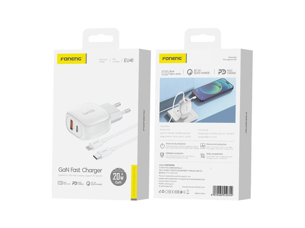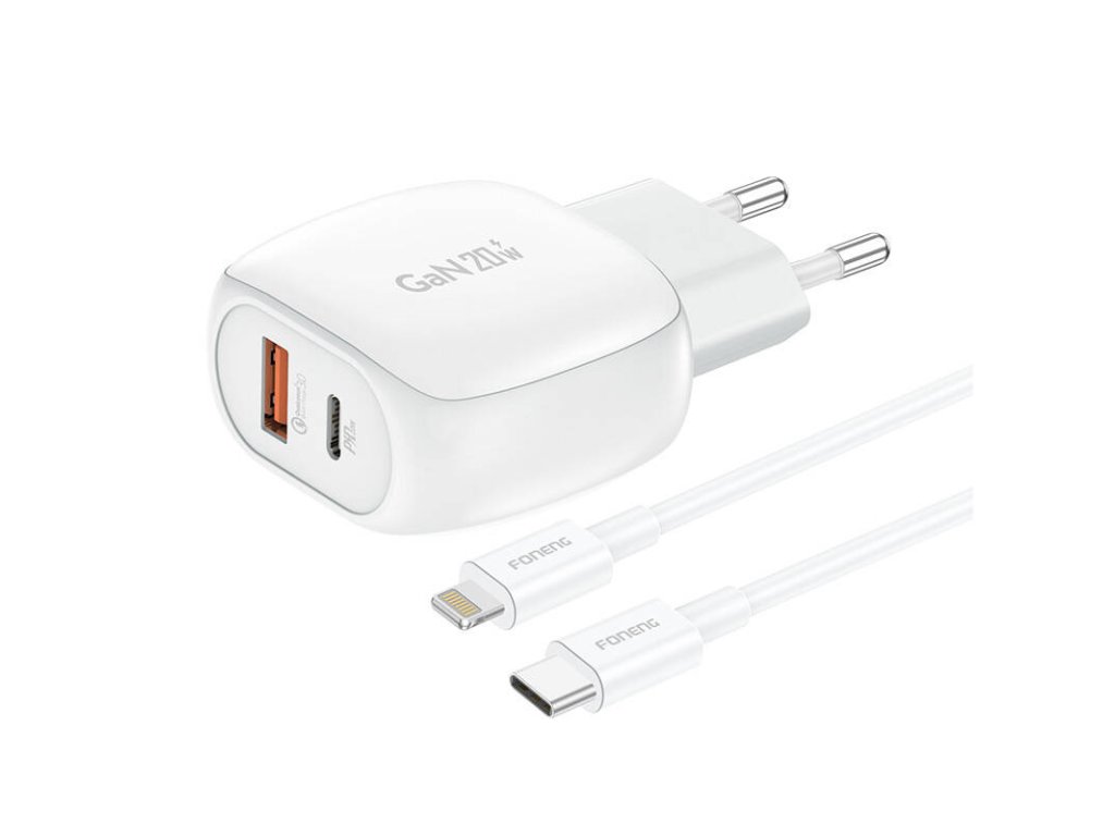 Foneng EU41 USB-C+USB-A 20W network charger + USB-C - Lightning cable (white)