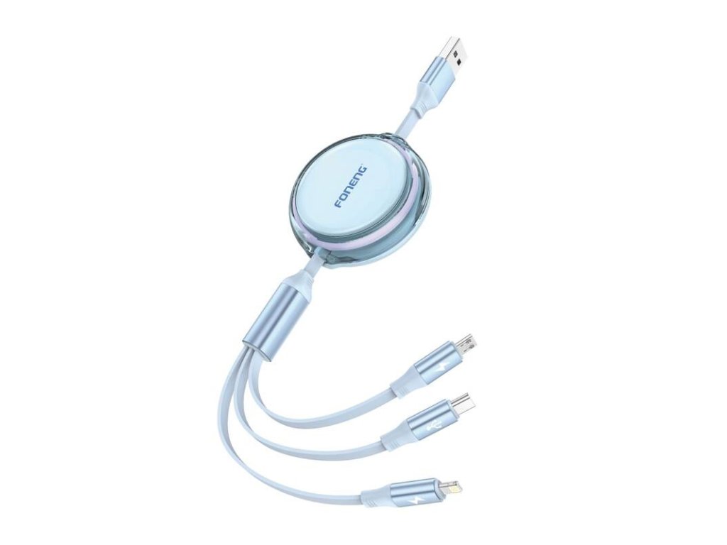 Kabel Foneng X113 má teleskopickou dvoustupňovou konstrukci, která umožňuje pohodlné škálování v obou směrech. Díky tomu můžete kabel přizpůsobit svým potřebám a zajistit si optimální délku a pohodlí. Podporuje nabíjení zařízení se třemi různými rozhraními: Micro (2,1 A), Lightning (2,4 A) a Type-C (3 A). Podporuje také přenos dat, takže je ideální volbou pro ty, kteří hledají rychlost a funkčnost v jednom.