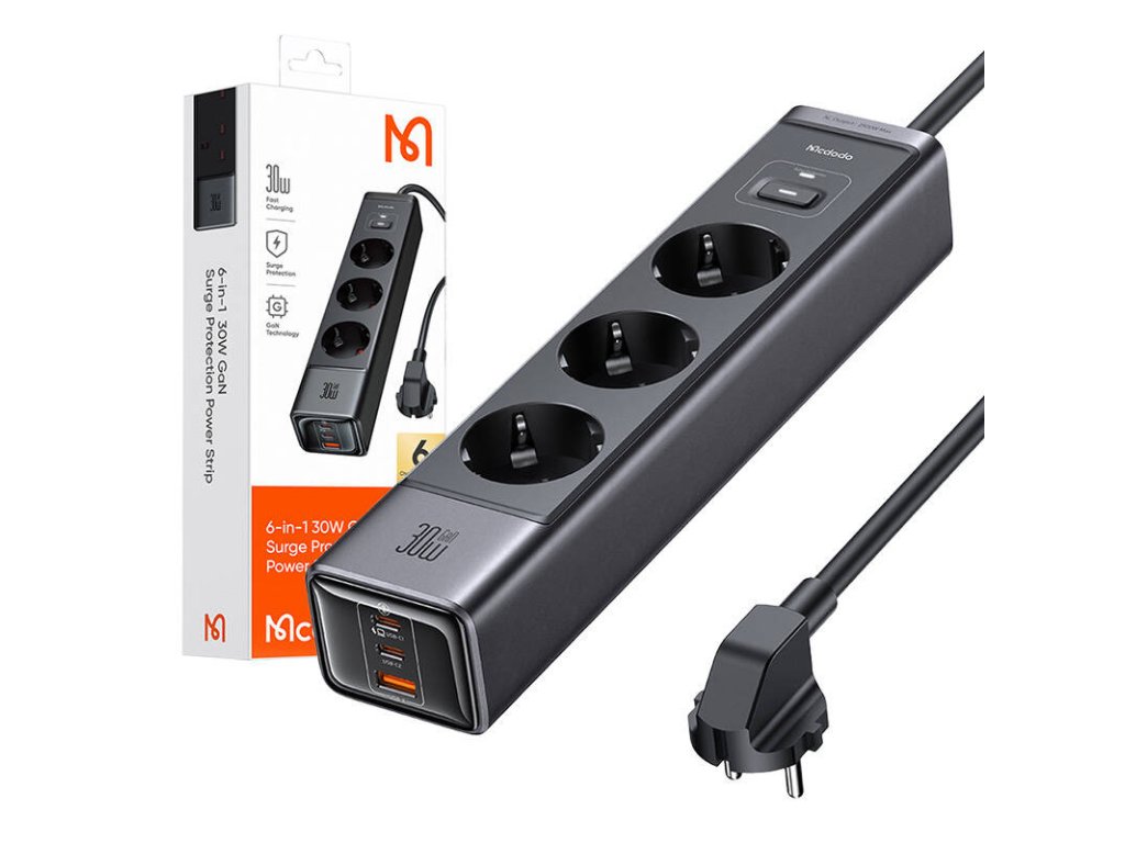 The Mcdodo CH-0620 power strip is an advanced 6-in-1 solution that combines convenience and safety with fast device charging. Thanks to GaN (gallium nitride) technology, the strip offers as much as 30W of power, allowing you to charge multiple devices simultaneously while maintaining a compact size and high performance.