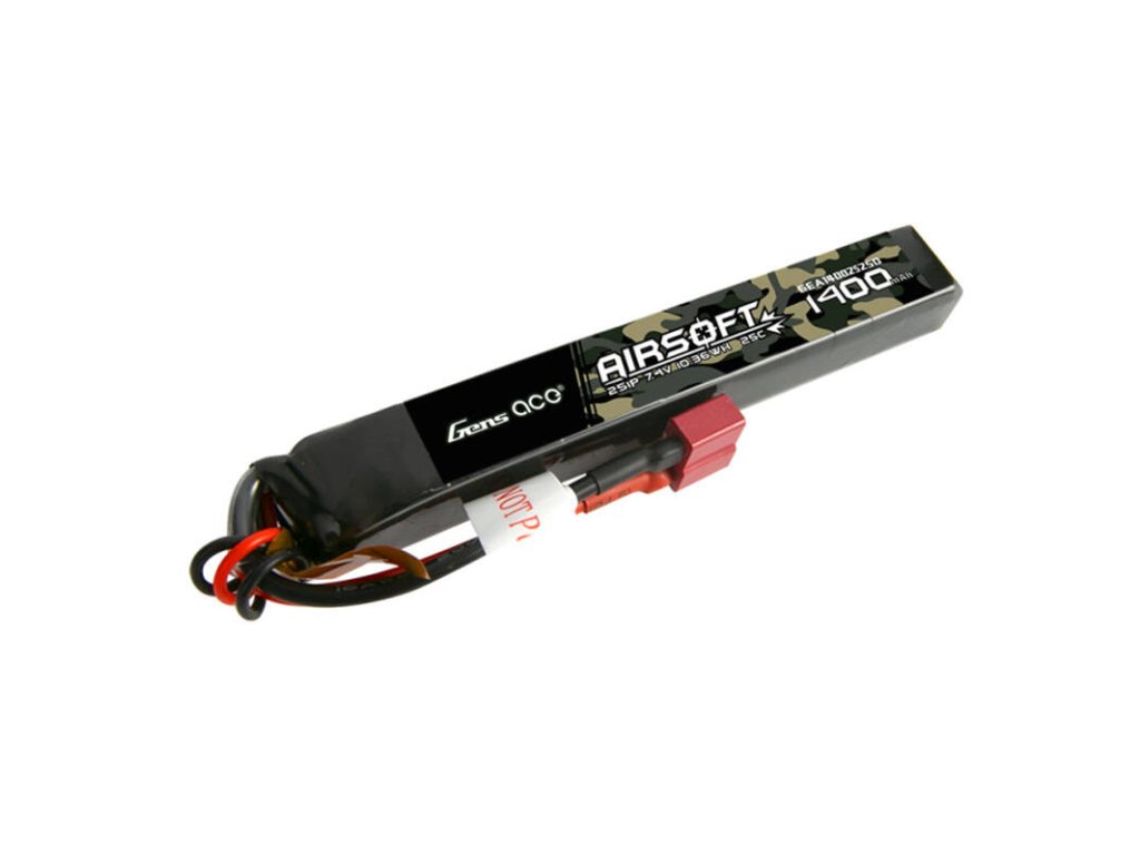 Lipo baterie Gens Ace 25C 1400mAh 2S1P 7,4V Airsoft Gun s T-konektorem je určena speciálně pro napájení airsoftových zbraní. Je vhodná pro nárazníkové trubice a AEG, kde je prostor pro baterii omezený, aniž by došlo k obětování výkonu. Hodí se do LE baněk, jako je M4 apod.