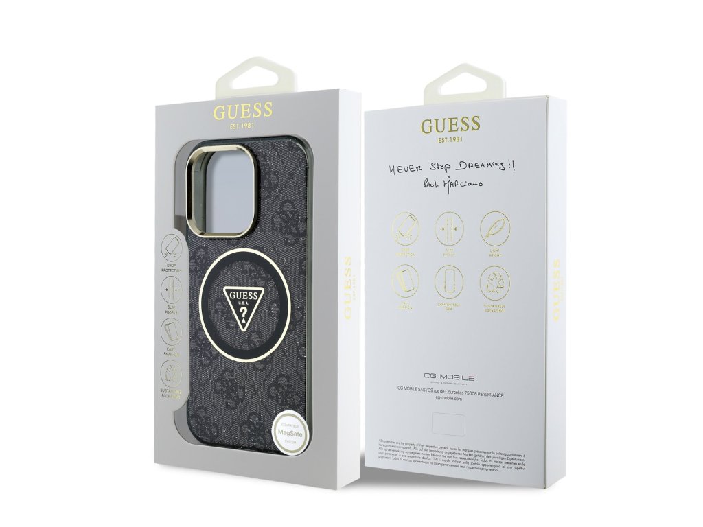 Design krytu vyniká triangle logem Guess ve zlatém kruhu a motivem 4G s jemnými třpytky na pozadí, což z něj činí nejen praktický, ale i stylový doplněk, který skvěle doplní váš outfit.