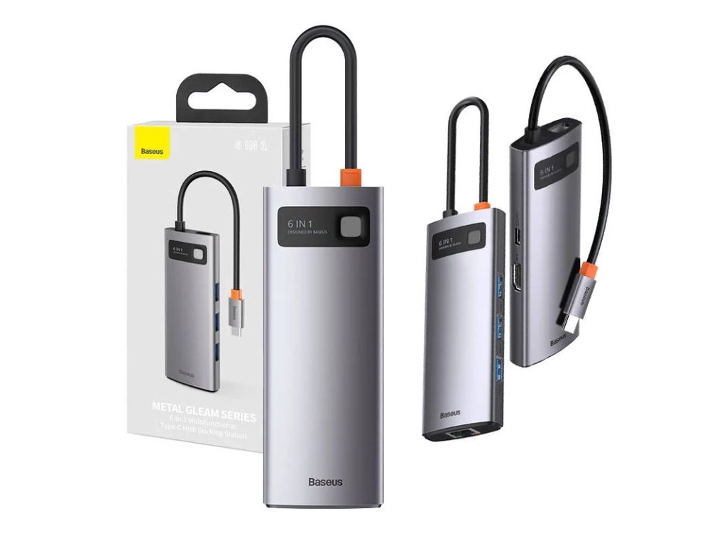 Hub 6v1 Baseus Metal Gleam Series, USB-C na 3x USB 3.0 HDMI USB-C PD Ethernet RJ45