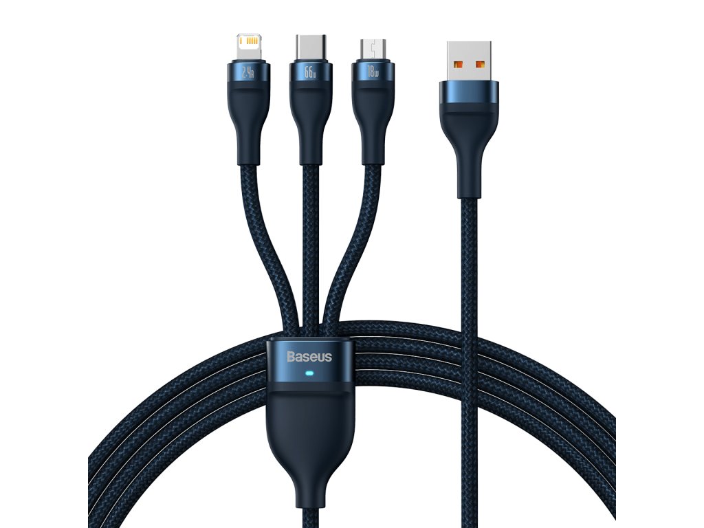 Kabel 3v1 USB Baseus USB 3v1 Baseus Flash Series, USB-C + Micro + Lightning 66W, 1,2 m (modrý)