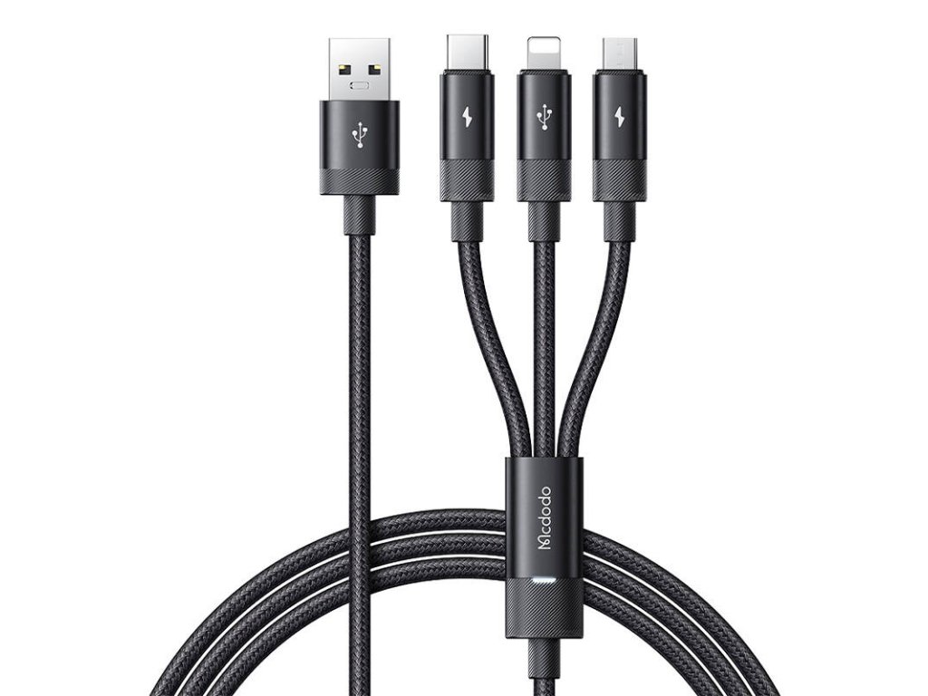 Pokud máte zařízení s různými porty, kabel Mcdodo CA-5790 se vám bude určitě hodit. Díky němu se vyhnete nutnosti používat více kabelů - stačí vám jeden. Výrobek vám poskytne konektory USB-C, Lightning a micro USB, takže k němu můžete připojit jak iPhony a smartphony s Androidem, tak i stolní ventilátory, Bluetooth reproduktory nebo powerbanky.