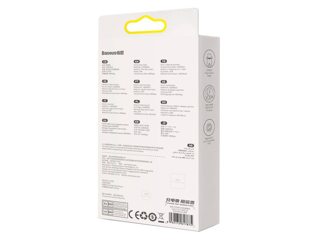 Produkt Baseus je vybaven inteligentním čipem, který zajišťuje spolehlivé nabíjení a kompatibilitu se systémy Apple, a také čipem E-Marker, díky němuž je používání kabelu zcela bezpečné. Pět pramenů drátů se silnějším jádrem urychluje proces nabíjení, zatímco díky kvalitní zinkové slitině je kabel pevný, odolný a nepoškrábatelný. Kromě toho je výrobek vybaven optimalizovanou strukturou SR, která umožňuje integrovanou ochranu zástrčky a delší životnost. Kabel byl vyroben novou technikou tkaní.