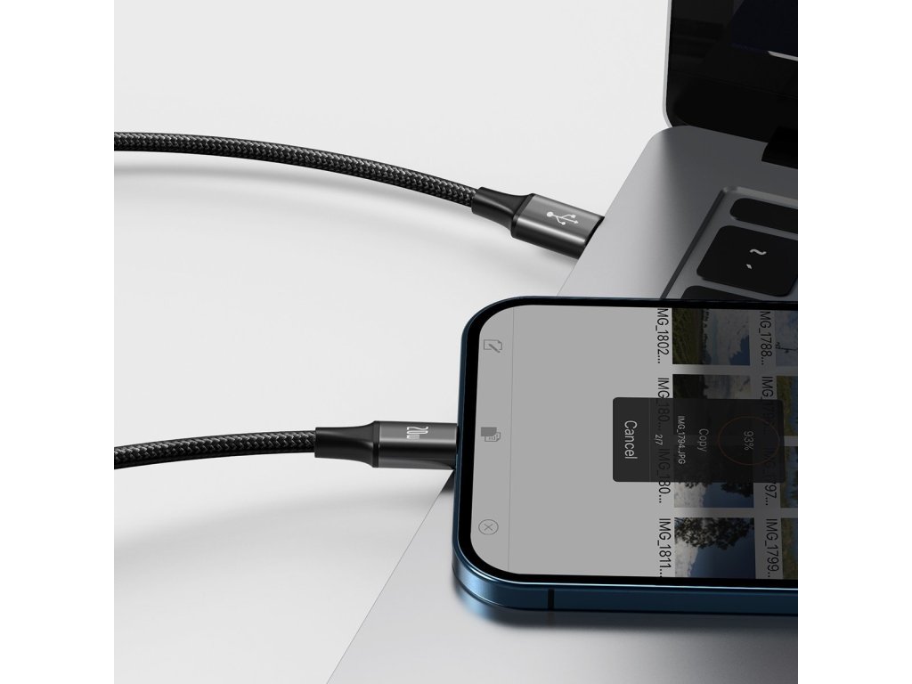 Pomocí kabelu můžete také bleskově přenášet soubory mezi zařízeními. Rychlost přenosu dat, kterou produkt nabízí, je až 480 MB/s. Díky tomu budete moci během okamžiku zkopírovat fotografie nebo videa z telefonu do počítače. Už nemusíte čekat hodiny, než se vaše soubory přenesou - s kabelem Baseus to bude trvat jen několik okamžiků.