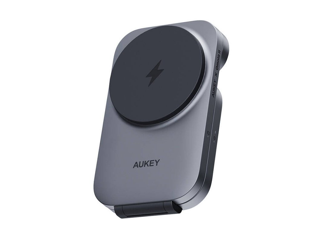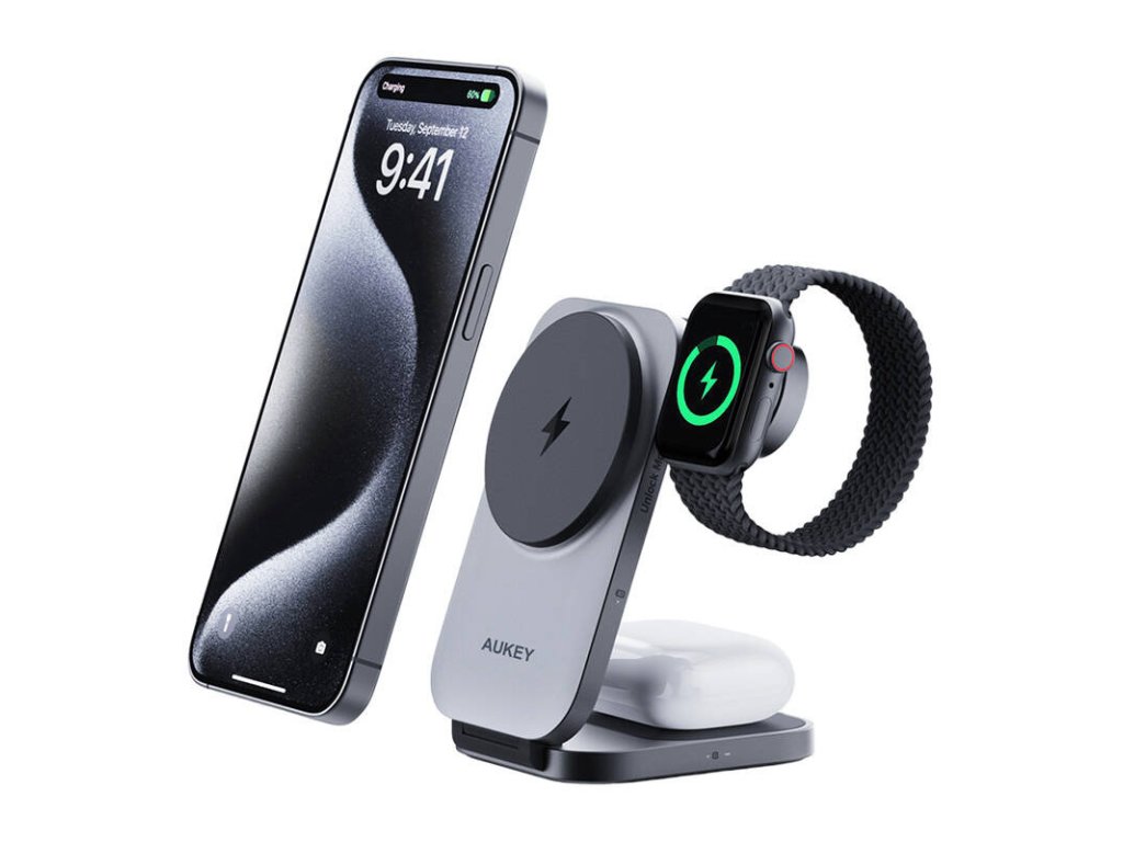 MagFusion Aukey LC-MC312 3-in-1 Magnetic Charger, 15W Qi2 (gray).