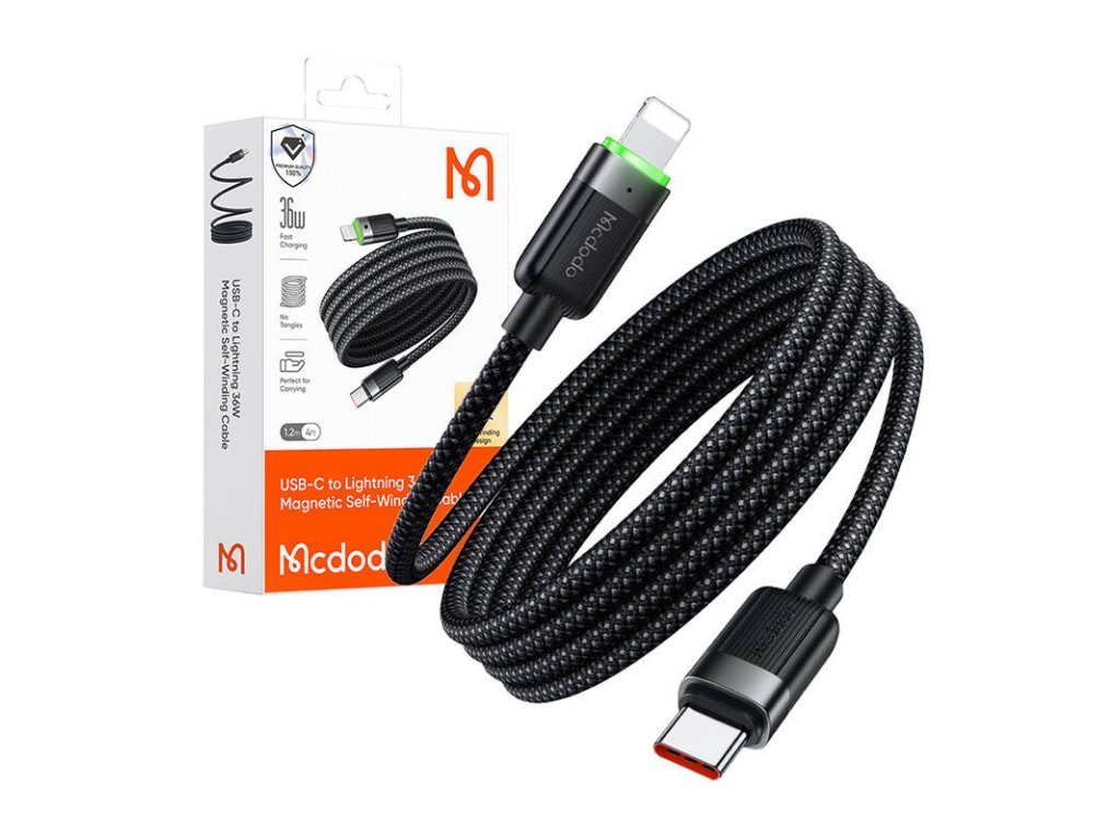 The Mcdodo CA-2010 cable is an innovative solution for those looking for a convenient and efficient accessory for charging their devices. With a self-winding feature, the cable automatically retracts after use, eliminating the problem of tangled wires. It offers fast charging with up to 36W of power, ideal for iPhones and other devices with a Lightning port.