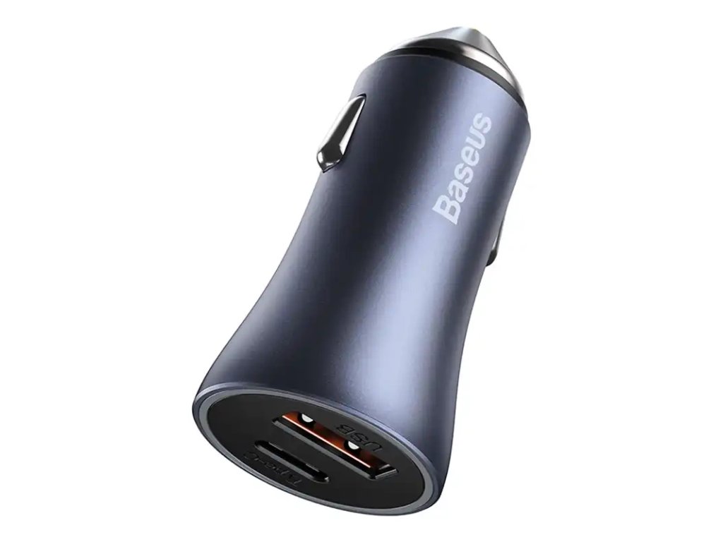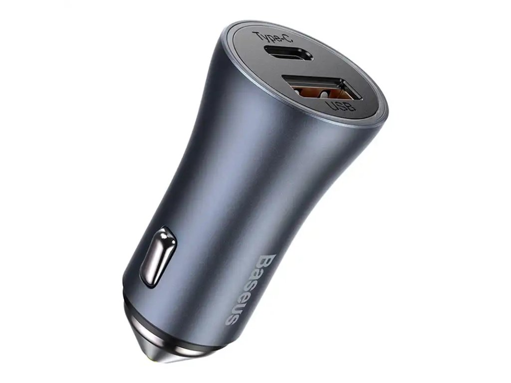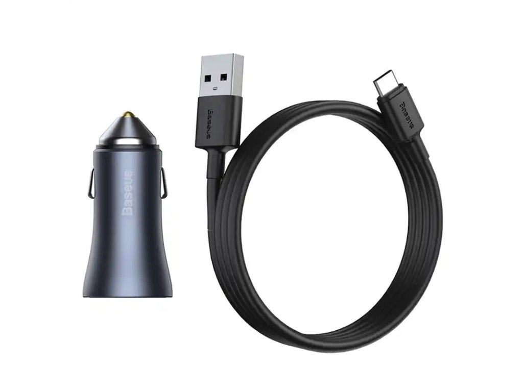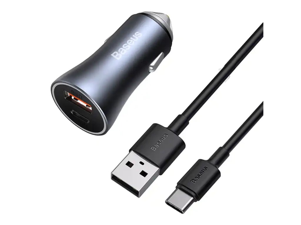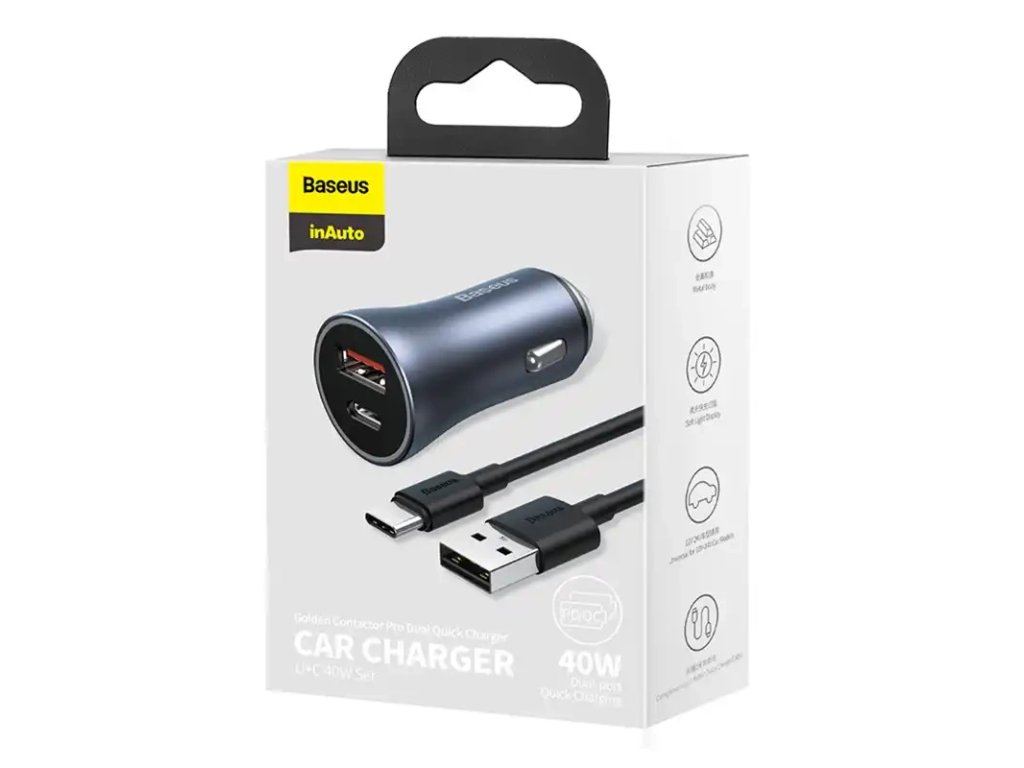 Baseus Golden Contactor Pro nabíječka do auta, USB + USB-C, QC4.0+, PD, SCP, 40W (šedá) + kabel USB do USB-C 1m (černý).