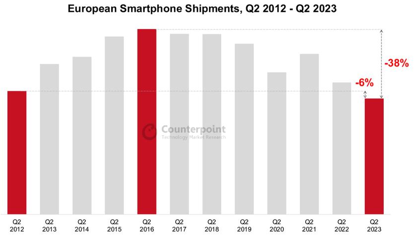 Druhé čtvrtletí roku 2023 skončilo dalším poklesem. Evropský trh s chytrými telefony poklesl o 12 % ve srovnání se stejným obdobím roku 2022 a o 6 % ve srovnání s druhým čtvrtletím roku 2012, čímž se obnovilo 11leté minimum.
