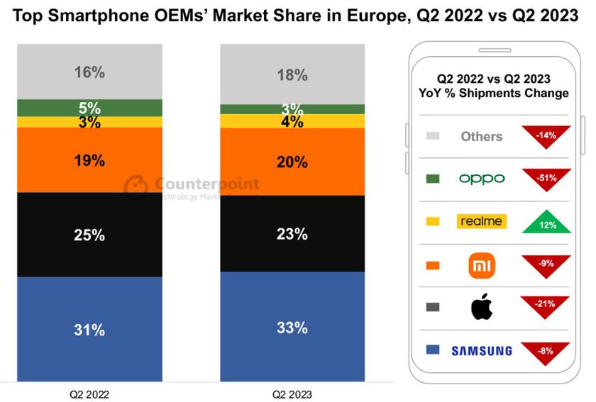 Samsung zůstal lídrem trhu. Podíl jihokorejského výrobce v Evropě činil 33 % oproti 31 %. Navzdory růstu se dodávky snížily o 8 %. Apple je na 2. místě s 23% podílem oproti 25% a 21% poklesem prodejů.