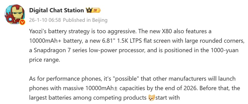 Připomeňme, že dříve Digital Chat Station tvrdil, že v roce 2026 se hodnota 10 000 mAh stane novým standardem pro většinu špičkových výrobců, a Honor již testuje baterii s kapacitou 12 000 mAh, zatímco jiný insider Ice Universe uvedl, že v příštích třech letech Číňané uvedou na trh smartphony s bateriemi o kapacitě 15 000 mAh, a ani to nebude limit!