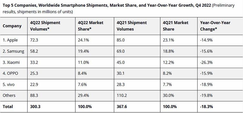 V posledním čtvrtletí roku 2022 byla společnost Apple opět lídrem trhu se 72,3 milionu dodávek a 24,1% podílem na trhu. Na druhém místě se umístil Samsung (58,2 milionu) s 19,4% podílem na trhu. Na třetím místě se umístila společnost Xiaomi (33,2 milionu). Čínská společnost zaznamenala největší pokles dodávek - o 26,3 % ve srovnání s hodnotami ze čtvrtého čtvrtletí roku 2021.