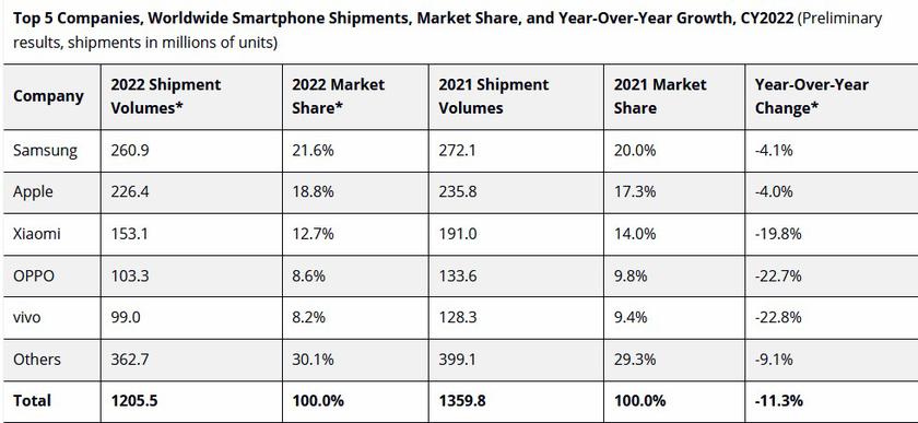 V ročním žebříčku vedl Samsung s 260,9 milionu kusů a tržním podílem 21,6 %. Druhé místo obsadil Apple s 226,4 miliony kusů a 18,8% podílem na trhu, zatímco na Xiaomi připadlo 153,1 milionu dodávek a 12,7% podíl na trhu.