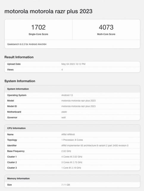 Motorola Razr+ 2023 dosáhla v jednojádrovém testu 1702 bodů a ve vícejádrovém 4073 bodů. Testem výkonu prošla modifikace vybavená 8GB pamětí RAM.