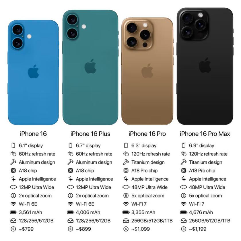 Modely iPhone 16 a 16 Plus si zachovají 60Hz obnovovací frekvenci a hliníková těla, ale získají podporu Apple Intelligence a nový čipset A18. Tyto modely budou mít 6,1 a 6,7palcové obrazovky, baterie s kapacitou 3561 mAh a 4006 mAh a také 12megapixelový ultraširokoúhlý fotoaparát a 2x optický zoom.
