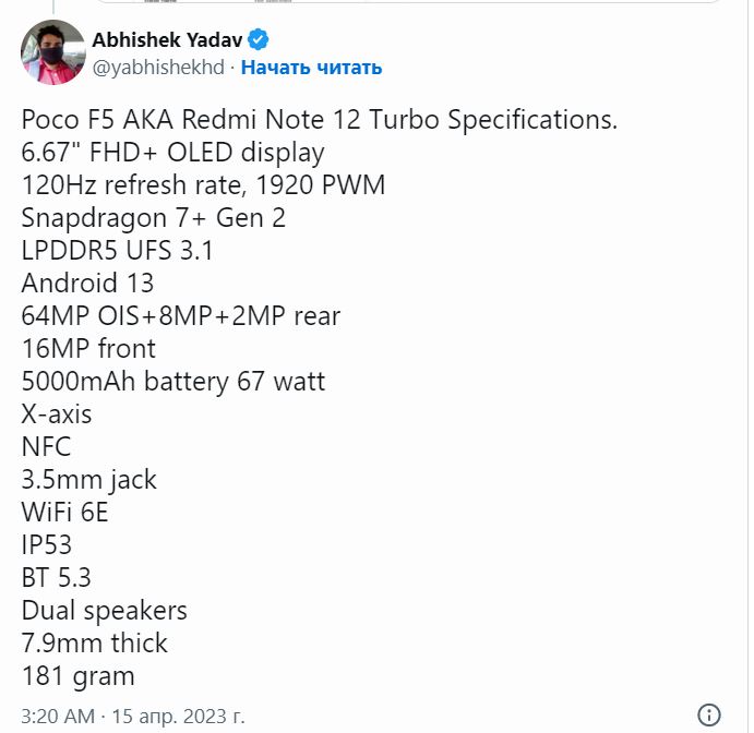 Podle zvěstí bude POCO F5 kopií smartphonu Redmi Note 12 Turbo, který byl odhalen v březnu v Číně. Novinka dostane OLED displej s vylepšenou 120Hz obnovovací frekvencí, nový procesor Snapdragon 7+ Gen 2, 5000mAh baterii s podporou 67W nabíjení, trojitý hlavní fotoaparát s 64MP hlavním snímačem, Wi-Fi 6, Bluetooth 5.3, NFC a ochranu proti vodě IP53.