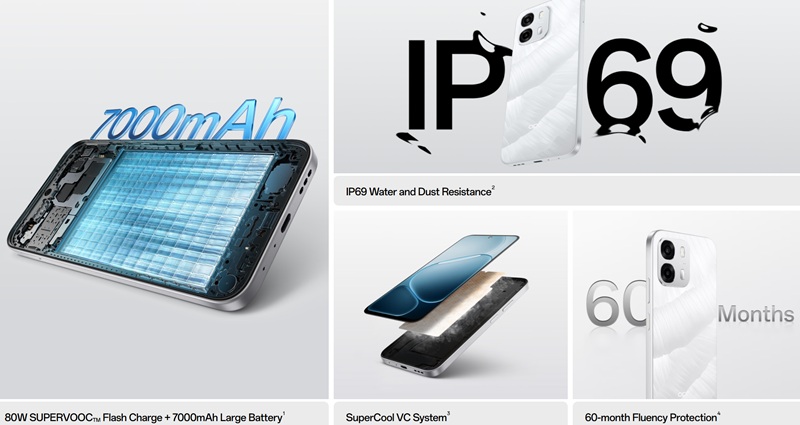V marketingových materiálech vyniká především baterie s kapacitou 7000 mAh, což je na cenově dostupný model solidní hodnota. Oppo A6s 5G získal podporu 80W nabíjení SUPERVOOC.