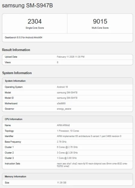Podle zdroje je globální verze Galaxy S26 Plus (SM-S947B) postavena na mobilní platformě Exynos 2600. V konfiguraci s 12 GB RAM dosáhl telefon 2304 bodů v jednovláknovém a 9015 bodů ve vícejádrovém testu.