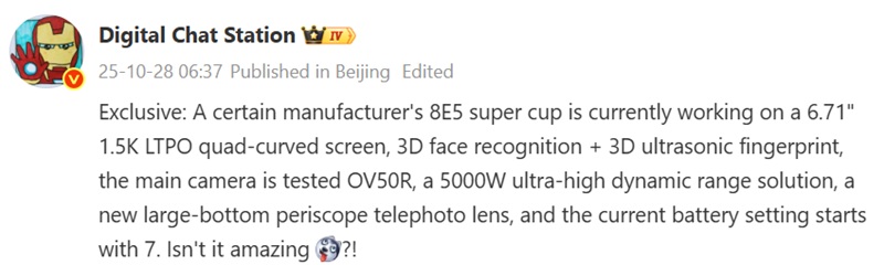 V bloku kamer se objeví senzory s rozlišením 50, 12 a 10 MP. Kapacita baterie bude 4300 mAh s podporou nabíjení až 45 W. Smartphone bude podporovat magnetické bezdrátové nabíjení Qi2.