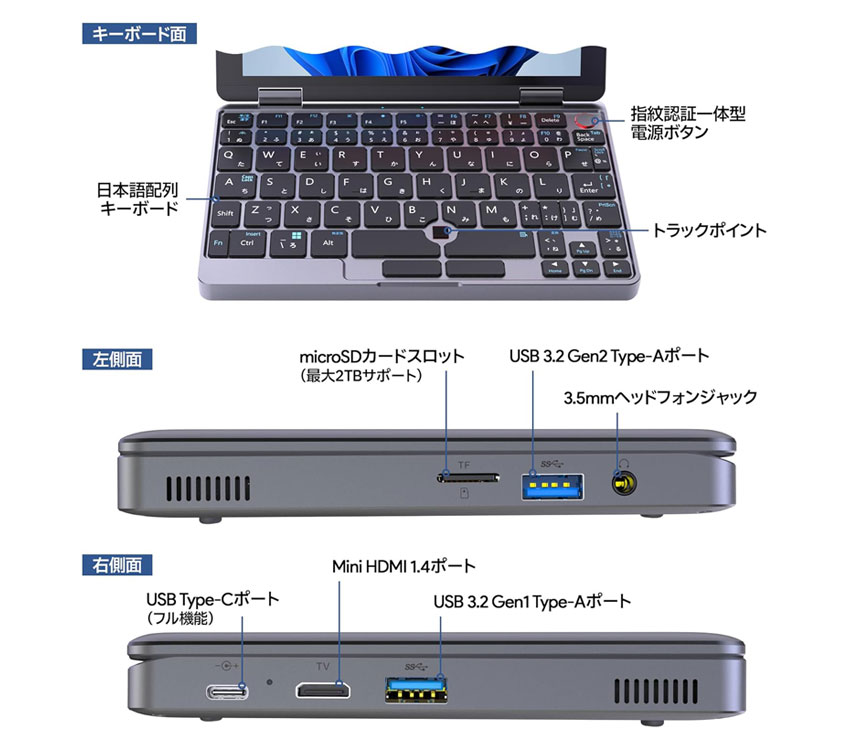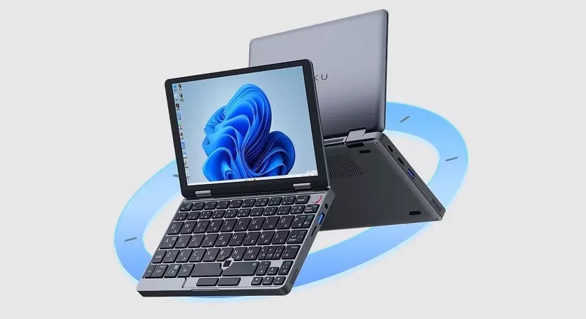 Název Pocket 8 přímo odkazuje na úhlopříčku displeje – 8 palců. Jedná se o dotykový IPS panel s rozlišením Full HD. Vzhledem k velikosti je hustota pixelů slušná, takže obraz by měl být ostrý, i když systémová písma bez škálování mohou vypadat mikroskopicky. Hlavním rysem konstrukce jsou panty, které umožňují otočit víko o 360 stupňů. To promění notebook v poměrně tlustý, ale funkční tablet. Tloušťka těla začíná na 18 mm a hmotnost je 658 g – to je stále výrazně méně než jakýkoli MacBook, ale znatelně více než iPad Mini.