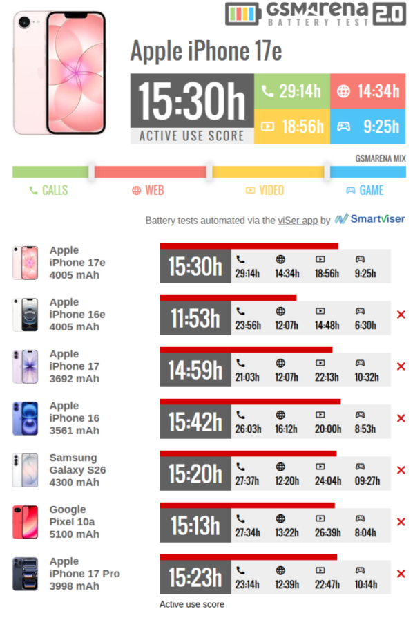 Při aktivním používání vydržel iPhone 17e 15 hodin a 30 minut. Tento výsledek byl lepší než u předchozího iPhonu 16e (11:53), základního modelu iPhone 17 (14:59) i verze iPhone 17 Pro (15:23). Kromě toho byl smartphone úspornější než konkurenční zařízení jako Google Pixel 10a (15:13) a Samsung Galaxy S26 (15:20).