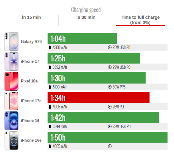 Nabíjení baterie z 0 na 100 % trvalo u iPhonu 17e 1 hodinu a 34 minut. To je o 15 minut rychleji než u předchůdce (1:50), ale stále zaostává za mnoha zařízeními s Androidem ve stejné cenové kategorii — například Samsung Galaxy S26 (1:04).