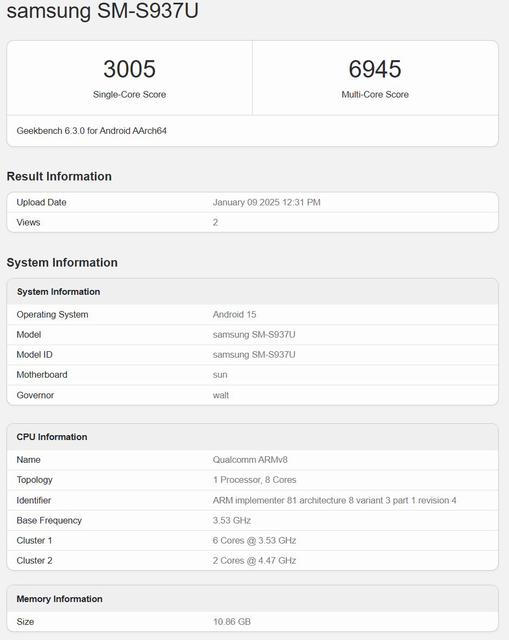 Na platformě Geekbench bylo spatřeno zařízení s modelovým číslem SM-S937U, což je pravděpodobně Galaxy S25 Slim (oficiální název se může lišit). Benchmark test ukázal, že smartphone poběží na stejném čipu jako běžné modely - Qualcomm Snapdragon 8 Elite for Galaxy. Podle výsledků testu však bude vícejádrový výkon smartphonu ve srovnání s mainstreamovými modely podhodnocen.