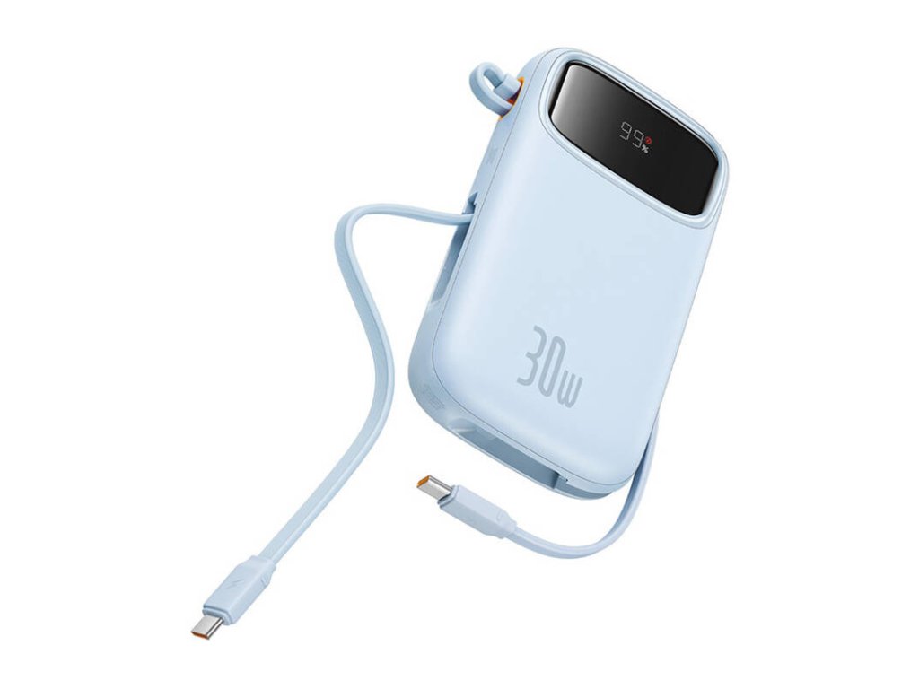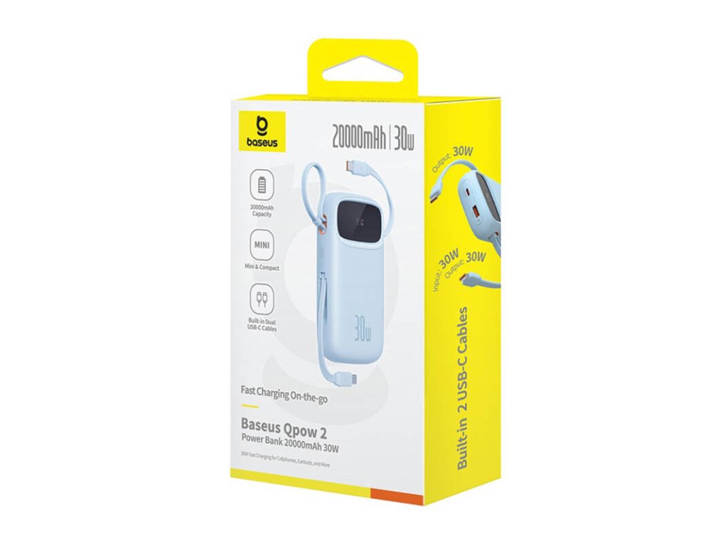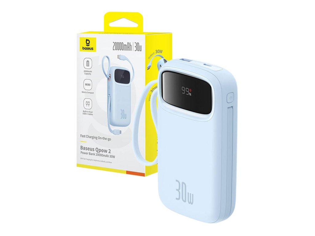 Forget about heavy and bulky powerbanks! Baseus QPow 2 is distinguished by its lightweight (360 g), compact design that will easily fit into any bag or backpack. Thanks to the convenient handle, you can always have it at hand, and the integrated USB-C cable eliminates the need to carry extra cables.