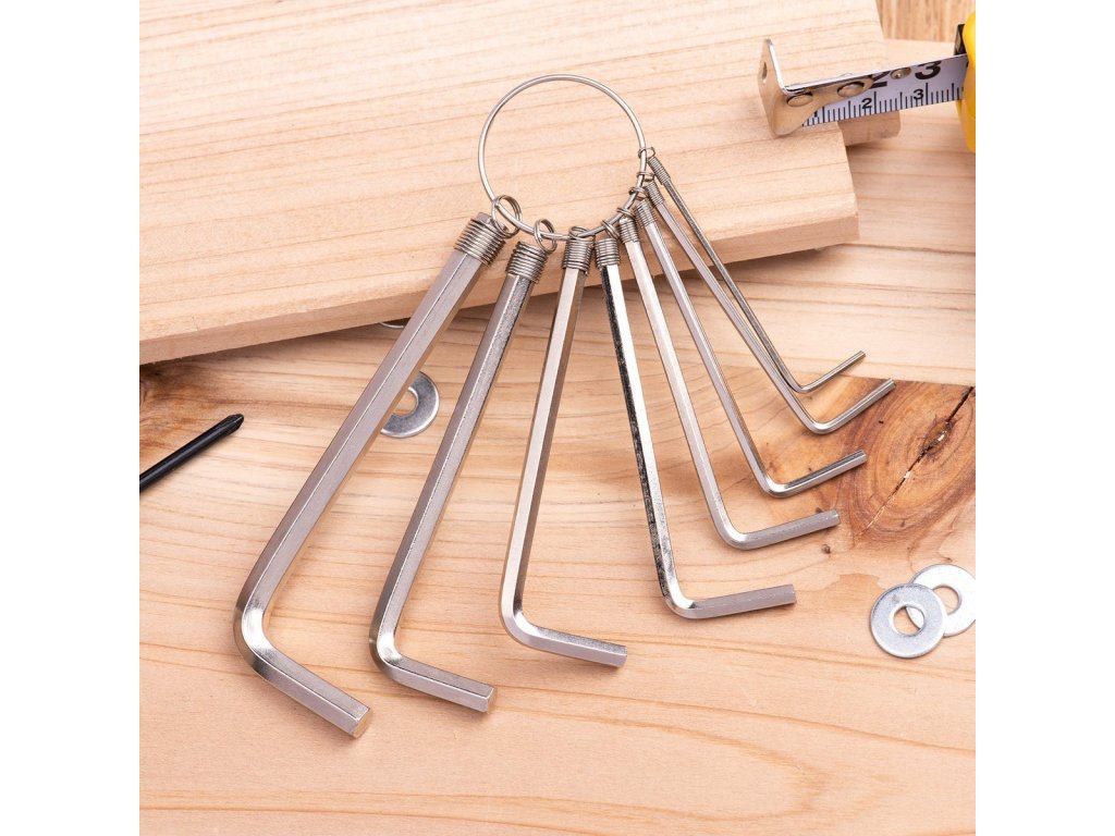 Sada 6 šestihranných klíčů různých velikostí. Kroužek, který je součástí sady, usnadňuje skladování a přepravu nástrojů a zároveň je chrání před ztrátou.