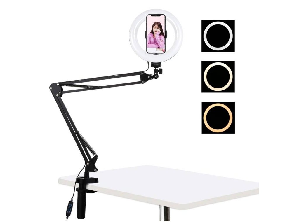 Kruhovou LED lampu můžete připevnit na držák a pomocí klipu ji připevnit na stůl. Hlavu držáku lze otáčet o 360° a nastavit podle vašich potřeb. Klip je kompatibilní s telefony o šířce 6-8,5 cm. Díky lehké a přenosné konstrukci se stativ pohodlně používá a přenáší. Vezměte si jej s sebou na cesty nebo například na venkovní focení.