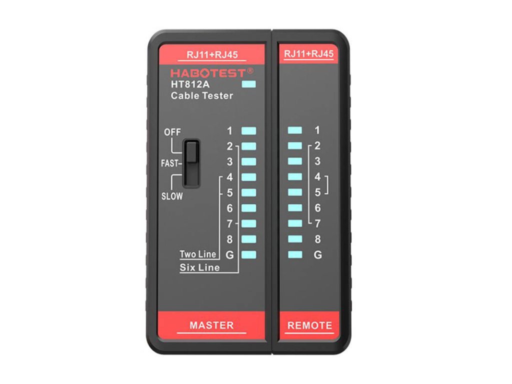 Pomocí testeru kabelů Habotest HT812A úspěšně získáte informace o výkonu kabelů s konektory RJ11 a RJ45. Snadno zkontrolujete hodnoty výkonu telefonních a síťových kabelů. Přístroj se vyznačuje kompaktním rozkládacím provedením. Napájí se ze 2 baterií typu AAA.