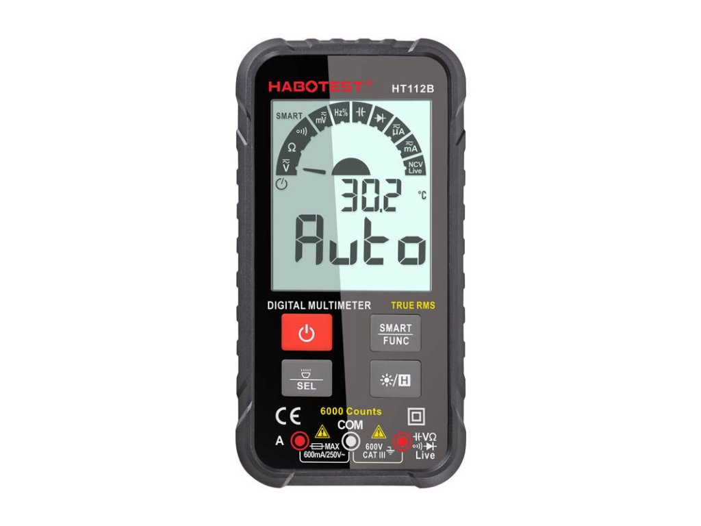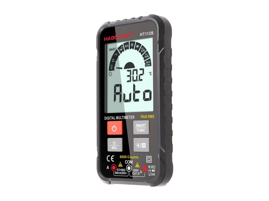 Multimetr značky Habotest vyniká neuvěřitelnou přesností. Přesně měří mimo jiné střídavé a stejnosměrné napětí, odpor a kapacitu. Rozpozná také činnost kabelů. S jeho pomocí můžete testovat diody, kontrolovat spojitost a skutečnou efektivní hodnotu. Umožňuje také bezkontaktní detekci napětí (NCV). HT112B je vybaven inteligentním provozem a automatickou detekcí ACV.