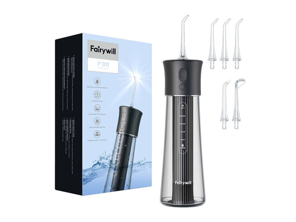 Nyní můžete o svou ústní hygienu pečovat ještě důkladněji. Irigátor FairyWill F30 nabízí na výběr až z 5 režimů a umožňuje důkladné čištění zubů. Odstraňuje až 99,99 % nečistot. Dodává se až se 6 vyměnitelnými tryskami, takže irigátor může používat celá vaše rodina. Irigátor F30 je také vodotěsný podle normy IPX7, takže jej můžete používat i ve sprše.