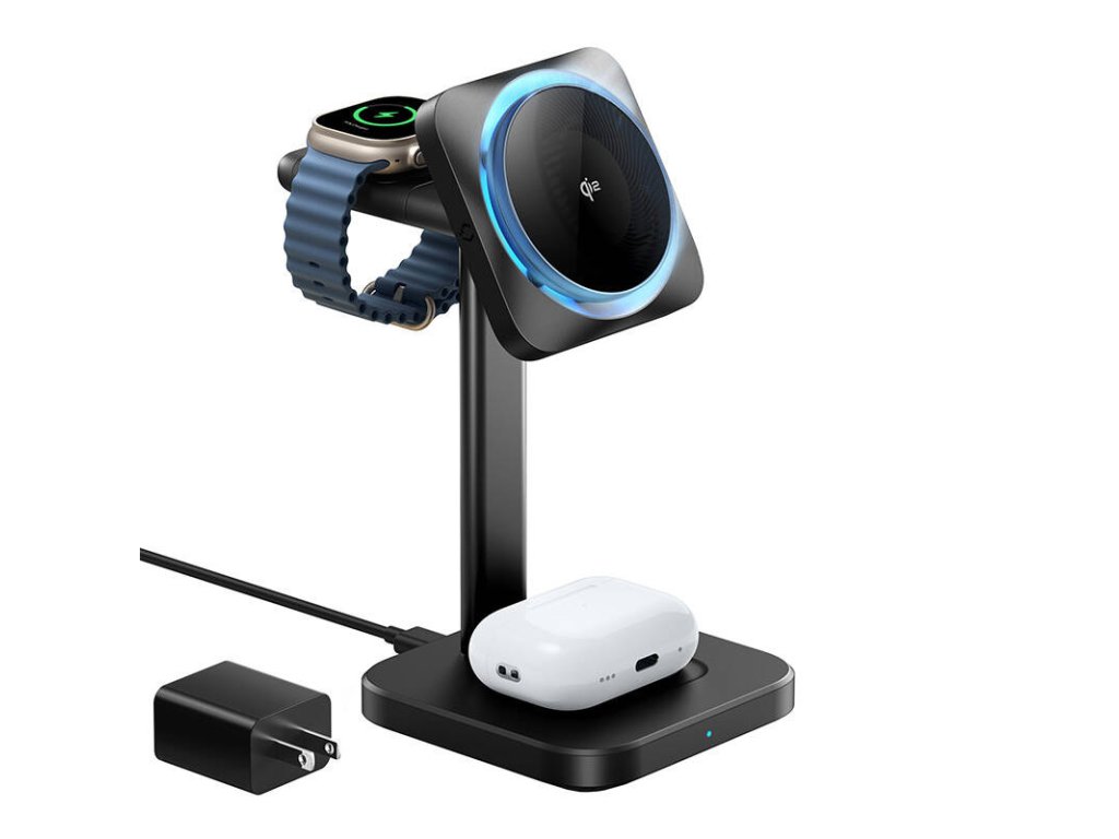 ESR's 3-in-1 charging station with CryoBoost technology is a solution that simultaneously charges your iPhone, Apple Watch and AirPods. Certified Qi2 and Apple charging, advanced security features and efficient cooling make this product ideal for a nightstand or desk.