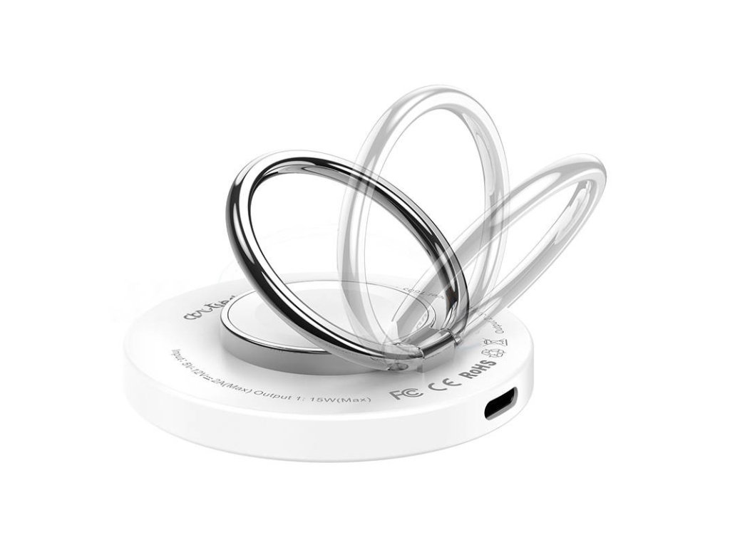 The charger, thanks to its design that resembles a standard phone holder, allows you to magnetically attach it to the case of your phone, which you can hold securely thanks to the ring grip. It tilts 180 degrees away from the case, so you can place your phone on a table at a comfortable angle and use your device while it charges.