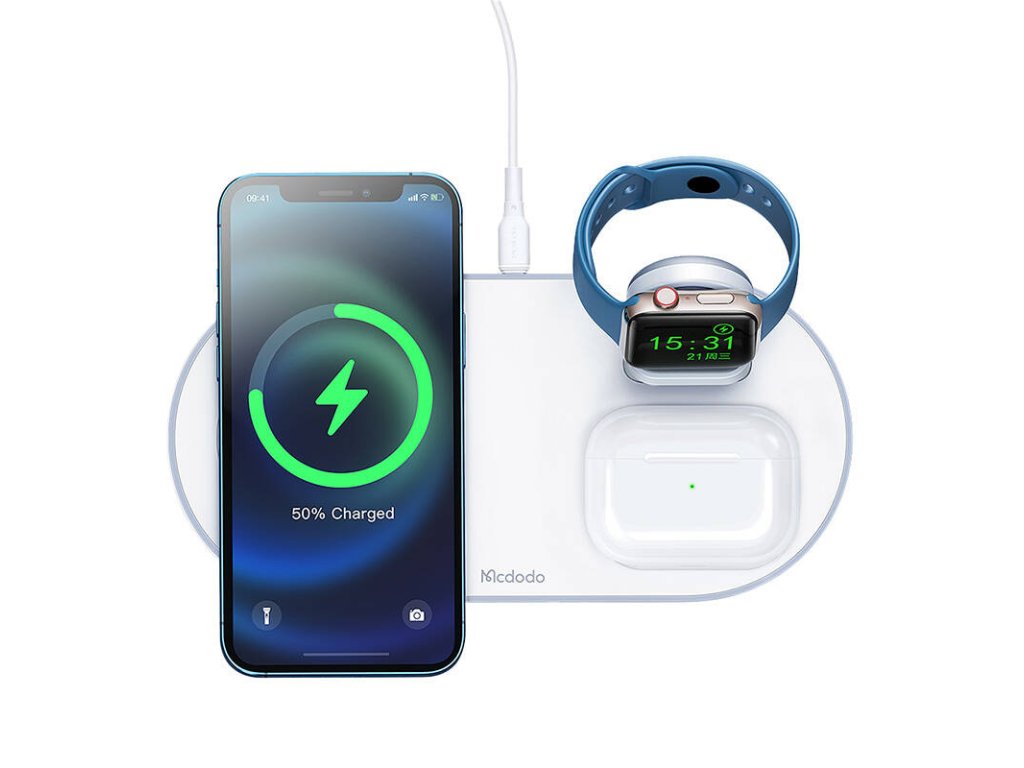 Now you only need one wireless charger to charge up to 3 different devices! The Mcdodo CH-7060 model allows for the wireless charging of your smartphone, AirPods, and Apple Watch simultaneously. It provides a power output of up to 15W and ensures safe usage. You can use it successfully in your living room, office, or bedroom, for example.